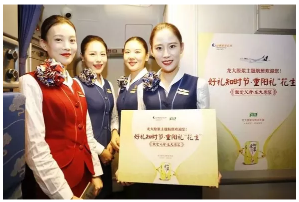 2018年10月17日,即農歷九月初九,在SC4698西安—青島的航班上,龍大糧油攜手山東航空打造了一場共賀重陽的“好禮知時節 重陽禮‘花生’”主題航班,精心為消費者準備了一份“油”愛的禮物,讓人們帶著愛回家。